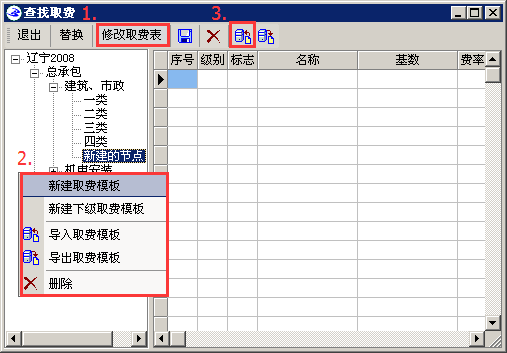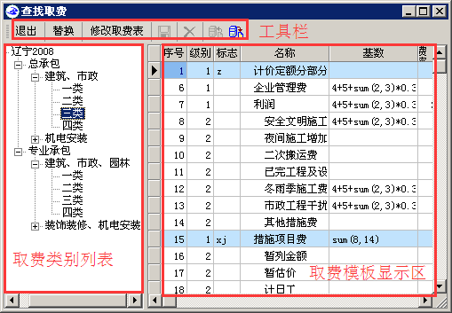 2.【替换】:若想更换取费模板,可以在此窗口中展开左侧的目录树,选择是“总承包”还是“专业承包”然后点击【替换】则就会将默认的取费模板替换掉。